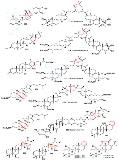 Initially, furanosteroids were identified in mushrooms nearly 80 years ago, characterized by the presence of an extra furan ring connecting positions 4 and 6 of the steroid skeleton. However, the term “furanosteroids” has since been expanded to include any steroids and related compounds that contain the furan ring, 2,3-dihydrofuran ring, 2,5-dihydrofuran ring, and/or tetrahydrofuran ring (s). It is believed that the strained furan cycle contributes to the diverse biological activities exhibited by these compounds. Several metabolites belonging to this class of natural products have garnered significant attention in pharmacological research due to their potent anti-inflammatory and antibiotic properties, potential anti-proliferative activity, and ability to inhibit inositide-3-kinase [8,9,11,12,13,14].