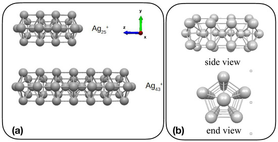 Real-time propagation has been carried out with WaveT [32,56]. WaveT simulations used as ingredients eigenenergies and transition dipole moments from AMS calculations [56,75]. In order to fill the visible energy range up to 5 eV, we included 750 and 2100 electronic states for Ag and Ag, respectively. 100-fs electron dynamics were simulated, with a time step of 1.21 as. A pulse intensity of W/cm was employed. FWHM of the resonant pulse from Equation (3) is equal to 15 fs, and that of the kick pulse is equal to 47 as. was set to 36 fs.