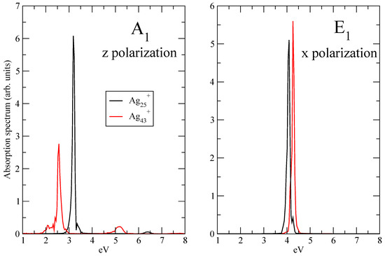 Absorption spectra A (z polarization, left panel) and E (x polarization, right panel) peaks of Ag and Ag. Spectra computed using the pulse of Equation (3). Spectra normalized to unity.