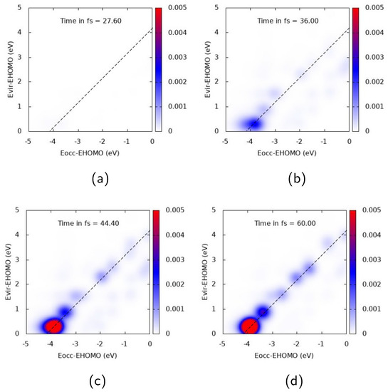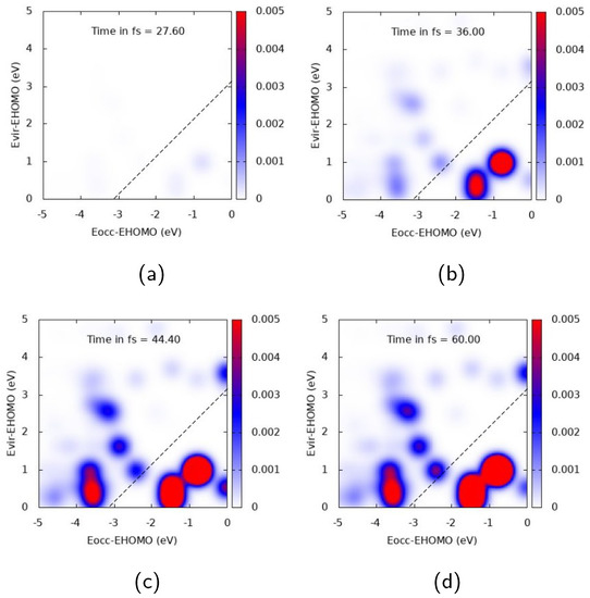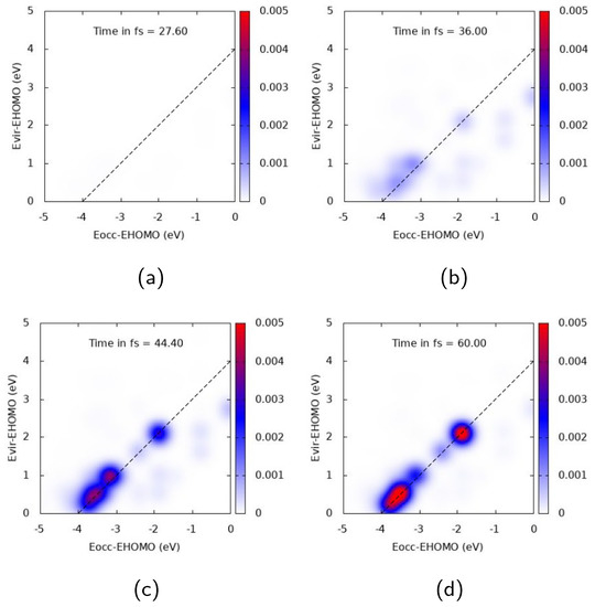 The nature of the electronic excitation of Ag dramatically changes when the pulse is polarized transversely to the cluster and resonant with the E transition ( = 4.078 eV), as shown in Figure 5. In this case, a strong diagonal structure is found, with the highest intensity at 44.4 and 60 fs, giving evidence of the fact that the photoinduced electronic density is dominated by a molecule-like excitation. At 60 fs, the largest spots describe a transition from deep MOs which are 3.5–4 eV below the HOMO to low-energy virtual MOs, and a transition from inner MOs (around 2 eV below the HOMO) to virtual ones 2 eV above the HOMO. TCM spots reach their maximum value well beyond the pulse maximum, confirming that the optical response of the cluster is characterized by a temporal delay with respect to the evolution of the pulse.