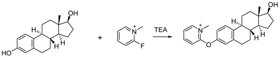 FluMP was selected as the derivatization reagent to react with estrogens due to its ability to react with primary and secondary alcohols, as well as phenols in complex mixtures [21,22]. Previously, our study showed that FluMP can effectively react with estrogens in solution (Figure 2) [23]. FluMP was also used to react and improve the signal response of cannabinoids [24] and buprenorphine [25]. After derivatization, a quaternary ammonium salt was introduced to the target estrogens and this significantly improved the signal response.