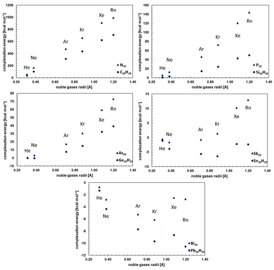 As can be seen in Table 1, carbon-based dodecahedranes exhibit very large (unreasonable) amounts of encapsulation energy ranging from 36.94–709.69 kcal/mol. Going down the IV main group along the periodic table, the silicon dodecahedrane cage has a significantly lower encapsulation energy for noble gases, which are linearly increasing with the increasing size of the noble gases radii (Figure 1). The germanium-based dodecahedrane cage has encapsulation energy for He and Ne of ~0 kcal/mol, with a further linear increase in the encapsulation energy going from Ar to Rn (from 7.64 kcal/mol to 39.28 kcal/mol, respectively). The tin cage releases energy upon hosting all noble gases, with the largest amount of energy released for hosting Ar and Kr (−5.63 kcal/mol and −6.41 kcal/mol, respectively), where He and Ne can be considered too small and Xe and Rn too large for the selected Sn20H20 cavity size. Noble gases with the smaller radii (He and Ne) are rather small for the tin cage cavity, while the ones with the larger radii (Xe and Rn) exhibit lower energy released due to their volume. The lead dodecahedrane cage better accommodates noble gases with larger atomic radii (Figure 1), ranging from −1.31 kcal/mol for He to the largest amount of energy released for Rn (−10.55 kcal/mol).