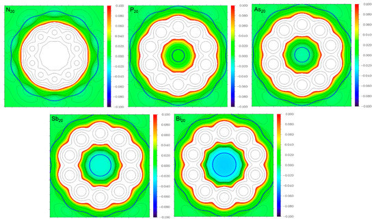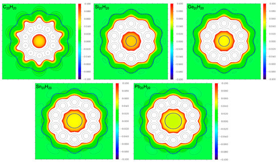 If we compare the encapsulation energies between the elements of the same period (Figure 1), we can see that in general elements of the IV main group of the periodic table have shown lower encapsulation energies compared to the elements of the V main group. This difference is very small for the noble gases with smaller radii, but this difference increases with the increasing size of the noble gases’ radii. Our suggestion for these phenomena is that the reverse side of a XH-group in X20H20 cages has less electron density compared to the reverse side of a X20 cages and that larger noble gases can therefore stabilize better. That suggestion can be supported by a color-filled contour line map of charge density for the investigated hosts X20H20 and X20 (Figure 2 and Figure 3). Whereby, examining the cavity for the selected hosts, in a case of X20H20, there is less electron density inside the cavity in comparison to the X20 cages cavities.