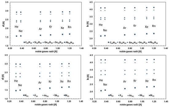 Geometric changes upon hosting a guest species can reveal insight into the flexibility of a host and its adaptability to accommodate a noble gas. In the case of the here selected dodecahedrane cages due to their symmetry, we selected two relevant structural parameters to describe their conformational change: bond distance between the atoms that are making a host (d; distance between the X adjacent atoms of a representative host) and the distance between one atom of the host to the hosted noble gas (b—distance between the X atom of the host and the hosted Ng atom). These geometric properties for the investigated hosts X20H20 and X20 are summarized in Table 4 and Table 5, and are plotted against the noble gas radii in Figure 4, respectively.