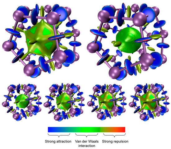 The large spatial interaction zones are in agreement with the complexation energies shown in Table 1 and Table 2, according to which the non-covalent interactions control the stabilization of the host–guest complex. The main stabilization energies are predominantly van der Waals by origin, while there is a strong repulsion in cases where the noble gases are too large for a cavity of the selected dodecahedrane cage.