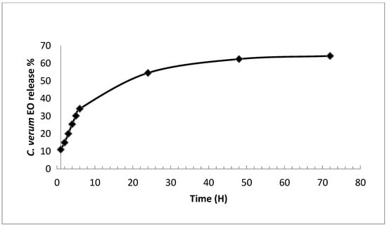The In-vitro release kinetics of C. verum EO from CN-NPs was determined in 20% ethanol and incubated at 30 °C. As shown in Figure 1, the release of C. verum EO from CN-NPs started at a fast rate and reached 54.55% release within 24 h. Subsequently, a slow cumulative release rate was recorded, reaching 62.4 ± 2.3% and 64.1 ± 2.6% release at 48 h and 72 h incubation, respectively. It could be suggested that the initial burst release might be attributed to the EO molecules adsorbed on the surface of CN-NP and oil entrapment near the surface [24]. The second stage was characterized by a slow release rate which might be related to the diffusion and the dispersion of the EO into the polymer matrix. This controlled release helps maintain its biological activity. Similar behavior for the biphasic release profile was observed for oregano, cumin, and Anethum graveolens EO from chitosan nanoparticles [46]. Polymeric nanoparticles based on chitosan are considered as an excellent drug carrier for the controlled release of the drug. Noteworthy, drug release from a CN-based nanoparticle system depends on the morphology, size, and density of the system. It depends also on the physicochemical properties of the drug as well as the presence of adjuvants. In fact, the in-vitro release of the drug from CN-NPs depends on pH, polarity, and the presence of enzymes in the dissolution system [54].