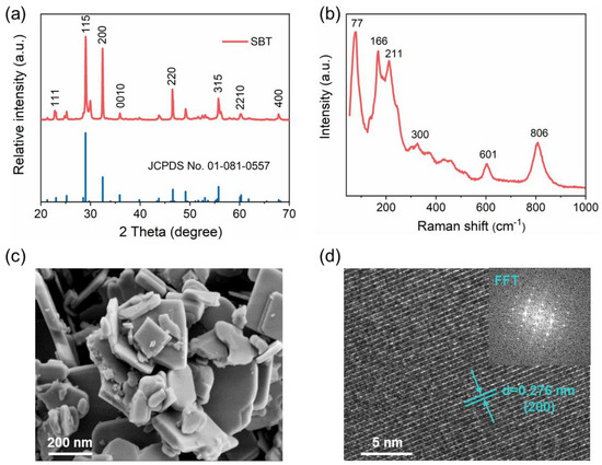 Structural characterization of SBT nanosheet. (a) XRD patterns; (b) Raman spectra; (c) SEM and (d) TEM image.