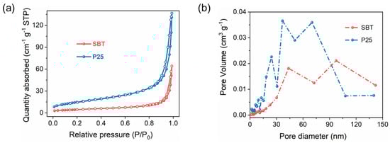 (a) Nitrogen adsorption–desorption isotherms and (b) the corresponding Barrett–Joyner–Halender (BJH) pore size distribution curves of SBT and P25.