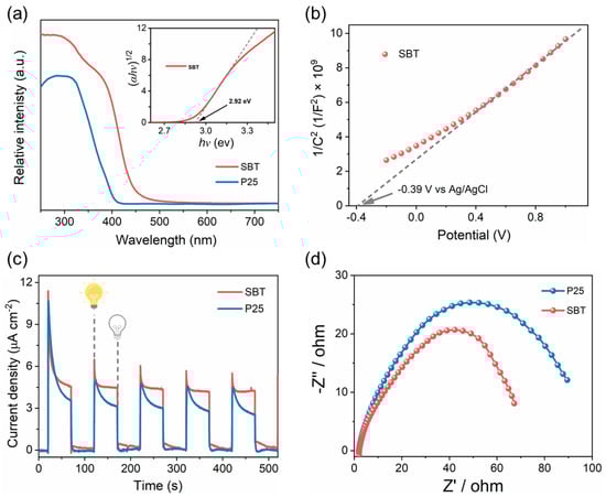 (a) UV–Vis diffuse reflectance absorbance spectra (inset is the Tauc plot) of SBT and commercial P25 samples; (b) Mott–Schottky plot of SBT; (c) transient photocurrent responses, and (d) Nyquist plot of impedance data of SBT and P25.