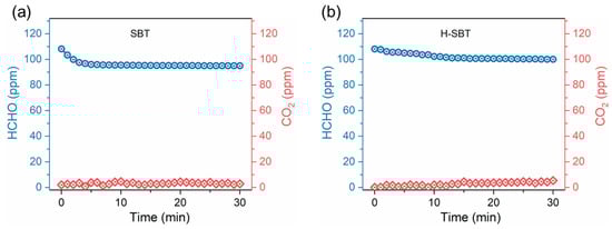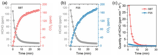 The room temperature activity of SBT for photocatalytic degradation of HCHO was investigated with P25 as the reference in a batch reactor. As shown in Figure 4a,b, after the reactions were carried out under irradiation for 30 min, the HCHO degradation rates of SBT and P25 reached 92.9% and 94.0%, respectively, which indicated that SBT has comparable HCHO degradation performance with P25 at the equal catalyst mass and completely degrade of HCHO molecules. However, for both SBT and P25, the corresponding increase in CO2 concentration was much higher than the decrease in HCHO concentration during the first 30 min. This may be caused by the following reasons: (1) On the one hand, during the injection of HCHO, HCHO molecules were primarily adsorbed on the inner wall of the reactor and reached adsorption equilibrium. When HCHO concentration in the reaction system decreased, part of the adsorbed HCHO would be released and then oxidized to CO2 at room temperature. (2) On the other hand, during the injection of HCHO, a small amount of HCHO may condense to form solid paraformaldehyde that could not be detected by the gas analyzer. This part of solid paraformaldehyde decomposed into gaseous HCHO molecules again during the reaction, thus becoming an additional carbon source. Therefore, the HCHO oxidation activity was slightly higher than the degradation of HCHO in the initial stage.