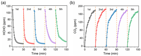 In addition, high stability is another important criterion and major pursuit. To evaluate the photocatalytic HCHO degradation stability of the SBT catalyst, we performed consecutive cycling experiments under the same conditions. As shown in Figure 5a,b, there is a negligible decrease in the level of the HCHO degradation rate by the long-term reaction. Moreover, for each cycle, the amount of CO2 production was always positively correlated with the amount of HCHO degradation, which indicated that the SBT catalyst could still completely oxidize HCHO into CO2 and H2O under a long-time working condition, further demonstratung the high reusability of SBT catalyst and its broad application prospects in the field of photocatalytic HCHO degradation.