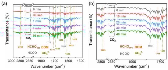 Figure 7a shows the in situ diffuse reflectance infrared Fourier transform spectroscopy of SBT exposed to a certain amount of HCHO, O2, and Ar gas mixture in the dark at different time intervals. The peak at 1716 cm−1 indicated that HCHO molecules were adsorbed onto SBT in the form of Lewis acid-base complexation. Peaks at 1418, 1475 and 2763 cm−1 corresponded to the vibration of dioxymethylene species (DOM) [36]. Formate species (HCOO−) were responsible for the peaks at 1558 and 1772 cm−1 [37,38]. Peaks at 1520, 1618, and 1681 cm−1 could be ascribed to the carbonate species (CO32−) [39], indicating that CO32− species were formed and accumulated during the dark adsorption process of HCHO on SBT. The intensity of the characteristic peaks of adsorbed HCHO and intermediate species (DOM, HCOO−, CO32−) increased significantly in the initial 1 min and remained stable after 10 min, indicating that the dark adsorption process of HCHO on SBT was very rapid. This was also consistent with the results of the adsorption experiment in Figure 7. In addition, the characteristic peaks at 2335 and 2364 cm−1 belonging to CO2 molecules showed almost no intensity change during the whole dark adsorption process [40].