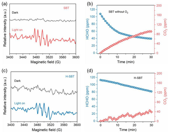 EPR measurements were carried out to investigate the active radical oxygen species in the whole process of photocatalytic HCHO conversion on SBT. Figure 8a displays the EPR spectra of SBT under dark and light conditions. A silent signal under dark conditions and a strong signal ascribed to DMPO −·O2− under light conditions were, respectively, detected [41], which implied that photogenerated electrons (e−) could combine with O2 adsorbed on the SBT surface to form activated superoxide radicals (·O2−) in the process of photocatalytic HCHO conversion. The poor photocatalytic degradation efficiency of HCHO by SBT in the absence of O2 further proved the key role of ·O2− in the whole reaction (Figure 8b). Figure 8c shows the EPR spectra of H-SBT under dark and light conditions, and the result was similar to that of SBT. It indicated that the removal of the [(Bi2O2)2+] layers had no obvious effect on the formation of ·O2−, but the oxidative activity of formaldehyde is greatly weakened (Figure 8d). Hence, these observations demonstrate that the poorer HCHO removal efficiency in the dark–light staged for H-SBT (Figure 6b) than SBT (Figure 6a) should be attributed to the limited formation of the Lewis acid-base complex rather than the ·O2− formation.