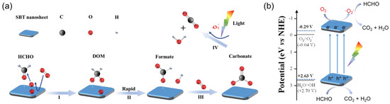 Based on the above results, a dark–light tandem catalytic mechanism was proposed for the conversion of HCHO to CO2 over SBT. As shown in Figure 9a, under the dark condition, HCHO is adsorbed onto the terminal [(Bi2O2)2+] layer of SBT in the form of a Lewis acid–base complex. Molecular oxygen (O2) adsorbed on the surface of SBT decomposes into active oxygen species, which can transform HCHO into DOM. Then, the DOM intermediate is oxidized to the HCOO− species quickly due to its chemical instability. In the presence of sufficient O2, HCOO− species will be further oxidized into CO32− species. However, the conversion from CO32− species to CO2 is hindered without light. Under light irradiation, the above process of HCHO → DOM → HCOO− → CO32− can also occur, but the difference is that SBT can be excited under irradiation to produce electrons and holes, thus leading to the formation of ·O2− through the reaction of photogenerated electrons with oxygen adsorbed on SBT. ·O2− can not only promote the process of HCHO → DOM → HCOO− → CO32−, but also completely convert CO32− into CO2 and H2O. Besides, the photogenerated holes (h+) with strong oxidation capability can also directly oxidize HCHO to CO2 and H2O. However, combined with the above energy band results, as illustrated in Figure 9b, the redox potential of H2O/·OH is higher than the VB potential of SBT, ·OH production is inhibited at the VB of SBT during the reaction. That is, ·O2− and h+ are the key active species in the process of photodegradation HCHO on SBT. Based on the above results, we can conclude that SBT firstly transforms HCHO into CO32− intermediate at night and completely converts CO32− intermediate into CO2 at daytime.