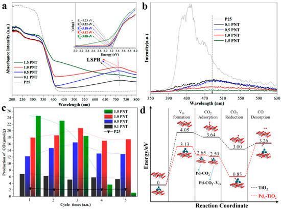 To lower the temperature needed in a thermocatalytic CO2 reduction and increase solar energy utilization, Ni et al., fabricated a palladium-nanoparticle-loaded TiO2 (PNT) catalyst employed using a photothermochemical cycle (PTC) method [73]. In this system, the uniformly dispersed Pd nanoparticles achieved LSPR absorption in the visible region. As a result, the PNT exhibited enhanced light utilization thanks to its red-shifted absorption range in the visible spectrum (Figure 1a). Absorbed visible IR light could then be converted to thermal energy and incorporated into a chemical reaction, allowing the 1.0 PNT catalyst to realize a stable CO production rate of 11.05 μmol gcat−1 h−1 (more than eight times the CO production rate of P25 using the PTC) (Figure 1c). The structure of the PNT catalyst also allowed the electron–hole pairs generated from the photoexcitation of TiO2 to be more efficiently separated (Figure 1b), thereby increasing the number of available charge carriers. Thus, the reduction rate of CO2 production can be accelerated by an advantage of photothermal synergy. Complementary density functional theory (DFT) calculations indicated that Pd can play a further role in promoting CO2 adsorption by forming Pd-CO2− and Pd-CO2−-VO at defect sites during the thermal catalytic progress (Figure 1d).