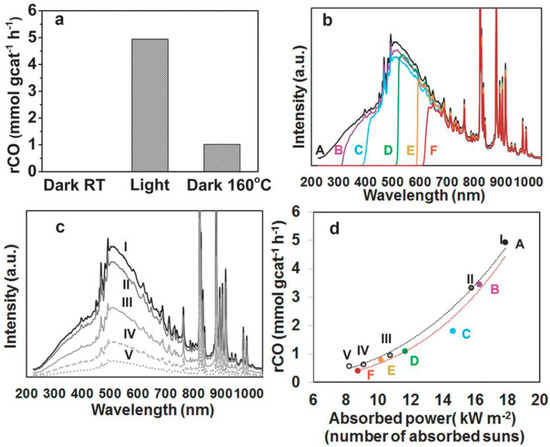 (a) Photothermal CO production rates over Pd@Nb2O5. (b) Spectral irradiance incident on the Pd@Nb2O5 catalyst with different cut-off filters (A through F). (c) Spectral irradiance incident on the Pd@Nb2O5 catalyst for batch reactions I through V. (d) RWGS reaction rates plotted as a function of absorbed power for the series of batch reactions A through F (red line) and I through V (black line) [74].