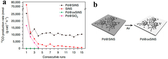 (a) 13CO production rate of four samples: Pd@SiNS, pristine SiNS, Pd@oxSiNS, and Pd@SiO2. (b) Preparation of the cAontrol sample Pd@oxSiNS via oxidation in air [40].