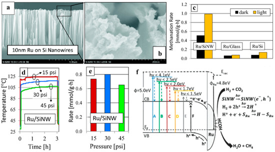 In another study from the same group, Ru/silicon nanowire catalysts (Ru/SiNW) (Figure 5a,b) were prepared by forming 10 nm Ru on silicon nanowires (SiNWs) via sputtering. In this case, the coexistence of Ru and SiNWs resulted in the possibility of activating the Sabatier reaction (CO2 + H2 → CH4 + H2O) both thermochemically and photochemically [81]. Detailed investigations were performed in the presence and absence of light irradiation (Figure 5c), with varying atmospheric pressure, (Figure 5d,e) and using varying wavelengths of light (Figure 5f) to better understand the internal mechanisms responsible for the observed catalytic activity. The results of these investigations revealed that the observed CO2 reduction mechanism could be predominantly photochemical or thermochemical, depending on the wavelengths of irradiating light. When the photon energy was less than the bandgap energy of silicon, the Ru/SiNW catalyst relied upon photothermal heating to activate the Sabatier reaction thermochemically. When the incident photon energy is sufficient to overcome the bandgap of Si, however, electron–hole pairs generated in the Ru/SiNW catalyst assisted the formation of R-H bonds. Eventually, a proportion of these excited charge carriers eventually thermalize and recombine, generating heat and supporting the thermochemical promotion of the Sabatier reaction. In this way, the prepared Ru/SiNW catalysts achieved a CH4 production rate of 0.74 mmol gRu−1 h−1 with a simulated solar light intensity of 14.5 suns, a 4:1 H2/CO2 ratio, and an atmospheric pressure of 15 psia. The concepts and the experimental approaches introduced in this work are significantly helpful for understanding the synergistic contributions of photochemical and thermochemical mechanisms to the overall process of photothermal CO2 reduction.