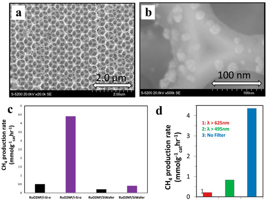 (a,b) SEM secondary electron images of ncRuO2/i-Si-O sample. (c) 13CH4 production rate from ncRuO2/i-Si-O and ncRuO2/Si wafer hybrid samples. (d) Photomethanation rates over the ncRuO2/i-Si-o catalyst tested under different illumination conditions [82].