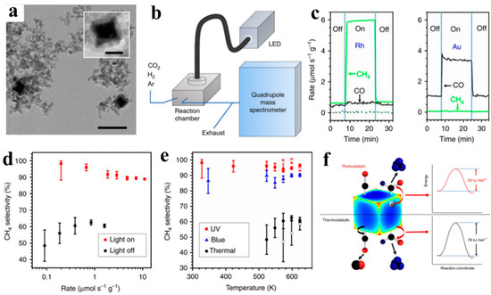 (a) Transmission electron microscopy (TEM) images of the Rh/Al2O3 photocatalyst (Scale bar, 100 nm (inset: 25 nm)). (b) Schematic of the photocatalytic reaction system. (c) Rates of CH4(green) and CO (black) production at 350 °C on Rh/Al2O3 and Al2O3 under conditions of dark and ultraviolet illumination at 3 W cm−2. (d) Selectivity toward CH4 as a function of overall reaction rates in the dark and under ultraviolet light. (e) Selectivity toward CH4 of the thermocatalytic and photocatalytic reactions. (f) Reaction mechanism on a rhodium nanocube (The black, red, and blue spheres represent carbon atom, oxygen atom, and hydrogen atom.) [83].