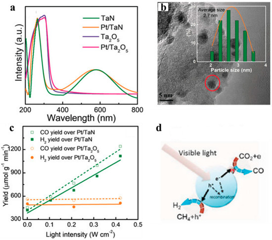 (a) UV-Vis spectra of TaN, Ta2O5, and the Pt-based catalysts. (b) TEM images of Pt/TaN. (c) Catalytic performance of Pt/TaN and Pt/Ta2O5 in the dry reforming reaction. (d) Mechanistic illustration of the visible-light-assisted dry-reforming reaction over Pt/TaN catalysts [84].
