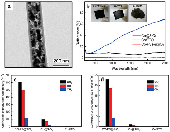 (a) Cross-sectional TEM images of Co-PS@SiO2. (b) Diffuse reflectance spectra of each cobalt catalyst material. Insets show the corresponding photographs of these samples. (c,d) Conversion rates of reagents and production rates of products from the catalyst normalized by (c) the mass of Co and (d) the surface area of Co [70].