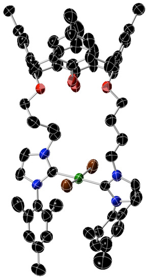 The X-ray data show (Figure 2) that 8 is a bis-Ni(NHC) complex with no cyclopentadienyl ligands bound to the nickel atom. The nickel was in a trans-square-planar geometry with two substituted NHC ligands and two bromides forming the coordination sphere of the metal. The geometry of the complex is analogous to many other complexes of the type trans-[NiX2(NHC)2] (X = Cl, Br, I) that have been reported and have been known for the last 25 years [50,51,52,53]. The coordination of the ligand around the nickel in 8 is broadly similar to what has been observed in such complexes. The calixarene part of this molecule adopted a cone configuration.