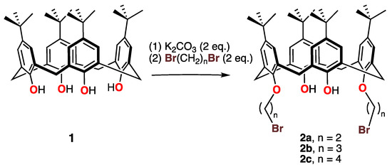 All reactions were carried out using an excess of α,ω-dibromoalkane. Potassium carbonate, used as a base, was added to an acetonitrile solution of 1 first and stirred for a couple of hours. Then, α,ω-dibromoalkane was introduced, and the mixture refluxed for a period of two days, as shown in the scheme.