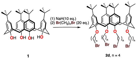 By treating the p-tert-butylcalix[4]arene 1 with 1-4-dibromobutane and an excess of a stronger base (NaH rather than K2CO3), the tetra-substituted compound 2d was obtained in moderate (41%) yield as shown in Scheme 2.The 1H NMR spectrum of this compound showed no signals that could be attributed to phenolic protons, as expected.