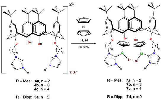 Synthesis of the organometallic complexes 7a–7d from nickelocene and calix[4]arene-bound imidazolium salts.