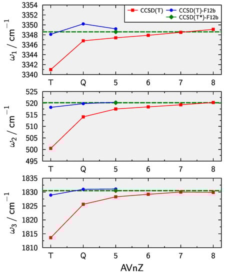 In Equation (3), is the harmonic vibrational frequency. The cubic and quartic force constants are denoted by and , respectively. They are obtained by numerical differentiation of the composite PES with respect to dimensionless normal coordinates . Various (ro)vibrational spectroscopic parameters can then be calculated by standard formulae [104,105,106,107,108], e.g., anharmonicity constants defining vibrational term energies for triatomic linear molecules