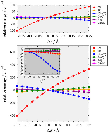 The dependence of smaller contributions on the internal coordinates is presented in Figure 2. The dominant contribution for the stretching coordinates (upper panel) and (lower panel) are CV effects. Effects due to HC only show a slight dependence on the CH-stretch whereas they are still significant for and act in the opposite direction of the CV contribution. These trends are in line with what has been observed previously [44,45,46,47,48,49,50,51,52,53]. In case of the bending motion (inset lower panel) it is clear that the inclusion of (Q)–(T) is important with a contribution of about cm at . For comparison the isoelectronic HCS ion [51] yields a slightly larger value of cm.