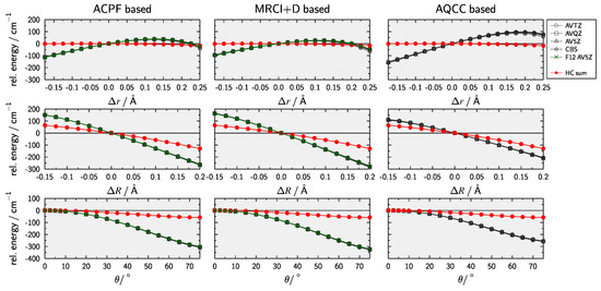 In order to rule out numerical issues due to the fitting procedure, graphical representations for 1D scans of the ACPF−CCSD(T) difference (including the same 3-pt CBS extrapolation as Huang and Lee [33,117]) along the internal coordinates , , and are provided in Figure 3. Furthermore, to check wether the problems are due to the treatment of dynamical correlation Figure 3 also shows results obtaind with multi-reference configuration interaction with singles and doubles [118,119,120,121,122] including the Davidson correction (MRCI+D) [123,124,125] and averaged quadratic coupled-cluster (AQCC) [126]. Finally, results obtained with explicitly correlated methods [127,128] and an AV5Z basis are also shown. From inspection of Figure 3 it is clear that, while there are subtle differences between ACPF, MRCI+D, and AQCC, none of the methods provides an accurate description of HC effects beyound CCSD(T). These difficulties could indicate that the actual problem is within the the reference used for the multi-reference approaches. It is well known that full-valence CASSCF can lead to problems in providing an appropriate active space. The reader is referred to the works by Veryazov et al. [129] as well as Stein and Reiher [130] for general discussions of this problem. Furthermore, the works of Makhnev et al. [131] on isoelectronic HCN and Schröder et al. [50] on nitrous oxide (NO) have highlighted this issue when constructing high-level ab initio PESs for triatomic systems. In summary, the HC contribution employed by Huang and Lee [33] based on the ACPF-CCSD(T) differenc is not recommended.