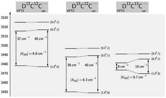 In Equation (10), are so-called “deperturbed” vibrational term energies and is the Darling-Dennison coupling matrix element. From two perturbed term energies of the and states alone one can not determine the three parameters in the effective Hamiltonian of Equation (10). However, given the excellent agreement between VPT2 and the variational calculations observed for HCC one can fix the to the perturbational results 2478.2, 2449.9, and 2473.4 cm for D12C12C, D13C12C, D12C13C, respectively. This yields values of 2515.7, 2488.0, and 2481.5 cm, to be compared with the VPT2 results of 2515.5, 2487.6, and 2481.2, for D12C12C, D13C12C, D12C13C, respectively, showing good agreement. The coupling constants differ only slightly between the isotopologues (cf. also Figure 4) with an average value of 6.6 cm. For a full analysis, i.e., for a deperturbation of rotational parameters, the effective Hamiltonian from Equation (10) would need to be extended to allow for the simultaneous ℓ-type resonance between and the state with e-parity [51]. However, no attempt in that direction has been undertaken here and therefore the parameters for DCC isotopologues have to be treated as effective parameters.
