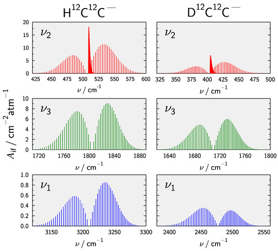 Finally, rovibrational line intensities for the fundamental transitions were obtained following Equation (9). At K the total internal partition function amounts to 180.33 for the main isotopologue, based on the present rovibrational calculations. Results for other isotopologues as well as different temperatures are collected in the Supplementary Materials Table S7. Figure 5 compares stick spectra for the fundamental transtions in HCC and DCC. Note that g in Equation (9) has been set to 1 to allow for direct comparison. The band is found to be the most intense fundamental transition followed by the CC-stretching which is weaker by a factor of about 2. These results are in line with the spectra calculated by Mladenovic et al. [32]. In all cases exchanging H for D reduces the intensities.