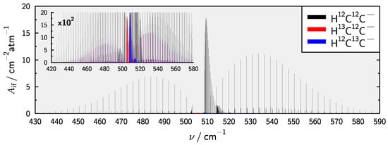Table 3 presents fc-CCSD(T) and fc-CCSD(T)-F12b results for the equilibrium dipole moment and band intensities of fundamental vibrational transitions for the main isotopologue. The negative sign for the dipole moment indicates the direction of the dipole vector pointing from the terminal C to the H atom, i.e., a polarity according to . Band intensities are obtained within the double harmonic approximation, i.e., harmonic wave function and linear dependency of the dipole moment with respect to normal coordinates. Using the present composite PES defines the harmonic wave function for the squared transition dipole moments. Both and the appear to be converged to within about 0.001 D and 0.2 km/mol or better, respectively, at the fc-CCSD(T)/AV6Z level of theory. The standard CCSD(T)-F12b and its triples scaled variant are very close to each other and match the conventional AV6Z results very well. An interesting observation regarding the stretching fundamentals can be made. While in isoelectronic HCN the CN-stretching band is very weak compared to the CH-stretching [133,134], the situation is reversed for HCC. In both systems the lower of the two streching band intensities results from a compensation effect of the dipole moment derivatives with respect to the (internal) stretching coordinates upon transformation to normal coordinates.