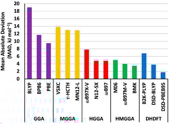 We begin by offering a few general comments concerning the performance of the selected DFT methods for the computation of gas-phase homolytic B–F BDEs. First, the best-performing method appears to be DSD-PBEB95/A′VQZ, for which we compute an MAD of just 1.8 kJ mol−1 and an LD of 6.4 kJ mol−1. In contrast, the worst-performing method was shown to be the HGGA functional BH&HLYP, which afforded an unacceptably large MAD of 45.6 kJ mol−1 and an LD of 54.2 kJ mol−1. The poor performance of BH&HLYP in the computation of BDEs has been noted previously, for example, the computation of Al–H [48], B–Cl [49], and N–X (X = F, Cl, and Br) bonds [54,55]. Second, in all but four cases, it is evident that the functionals considered in this study tend to underestimate the BDEs (i.e., the MD values adopt negative values in most cases). Third, for the majority of functionals, the most problematic BDE to compute appears to be that of (NC)2B–F (molecule 10), with approximately two-thirds of the functionals appearing to struggle with the computation of this bond dissociation energy. Prior to discussing the specific performance of the various functionals within each rung of Jacob’s Ladder (i.e., GGA, MGGA, HGGA, HMGGA, and DHDFT), Figure 1 provides a graphical representation of the MADs of the three best-performing functionals in each rung of Jacob′s Ladder.