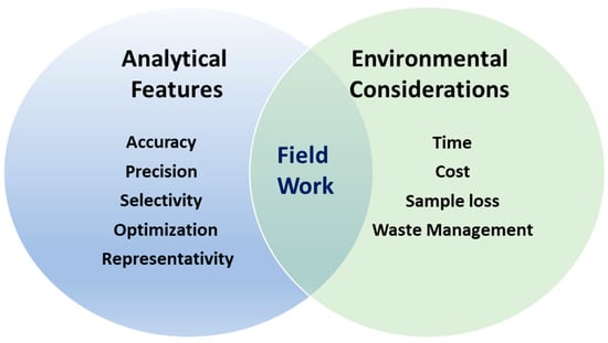 From an analytical perspective, the defining attributes of a technique that are considered most important to the analyst when applying the most appropriate method in order to obtain meaningful information are accuracy, precision, specificity, and sensitivity [15]. In this context, quantification is critical for sample assessment and comparisons between analytical approaches and methodologies. However, in real time, there are certain practical factors to consider, such as the time necessary to conduct a sample analysis, costs, and user friendliness of the technique, that are essential environmental and analytical considerations. The environmental and ecological perspective is relatively new in analytical chemistry, and in terms of MP research, this should be carefully embraced to ensure the long-term evolution of analytical approaches for the field of MPs (Figure 1).