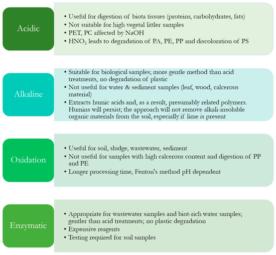 - Enzymatic digestion: Among acidic digestion, alkaline digestion, and enzymatic digestion, the latter seems to be the most effective, with no visible impact on MPs during treatment [31].