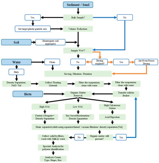 The identification and characterization of the MPs is based on extraction and purification, followed by identification and quantification, including the incorporation of quality-control measures at each step. The extraction of MPs from any environmental matrix is the most crucial step, as it is influenced by the size, shape, and density of both the matrix type and MPs present. It thus follows that a possible differentiation of the extraction processes can be based on the type of matrix being analyzed. The MPs must be isolated from the environmental matrix for characterization and identification purposes. There are many articles highlighting the sampling and the extraction process for complex matrices. In addition, owing to various factors, such as funding, demographics, laboratory resources, and the type of matrix, new protocols are continually developing. Several papers have been published in recent years on the presence, content, distribution, and contamination of MPs in various environmental matrices but not in a systematic manner. To the authors’ knowledge, there are no evaluations that comprehensively and simultaneously illustrate the methodologies for extracting MPs from a wide range of environmental matrices, as most reviews are matrix-specific [7,8,9,10,11,12]. This study aims to classify and incorporate the most recent developments and newest technologies for the different matrices frequently analyzed for MPs in a compact and concise manner. The review is divided into two sections: the first section traces the origin of the original method, prior to modification over time, and the second section provides a detailed account of the different extraction methodologies that are currently in use for different matrix types.