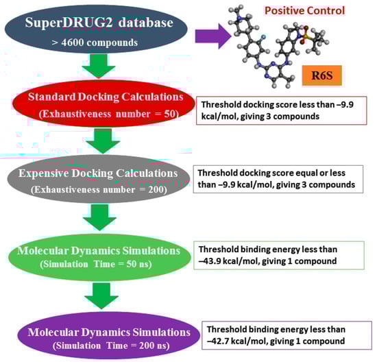 Herein, the SuperDRUG2 database, which contains >4600 pharmaceutical compounds, was screened against BRD4-BD1. Molecular docking was utilized to filter the database, and the most potent BRD4-BD1 inhibitors were undergone MD simulations. The inhibitor-BRD4-BD1 binding energy was evaluated utilizing the MM-GBSA approach. Ultimately, physicochemical and ADMET features were predicted for the most promising drug candidates. The workflow of the utilized in silico methods is shown in Figure 1. This study identified a compound with a promising inhibitor against BRD4-BD1, and additional experimental investigations are recommended.