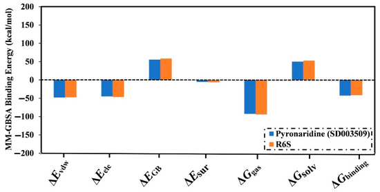 A binding energy vs. time analysis was conducted to investigate the steadiness of pyronaridine and R6S inhibitors within the BRD4-BD1 binding pocket (Figure 6). According to Figure 6, pyronaridine and R6S displayed excellent stability, with ∆Gbinding values of −42.7 and −41.5 kcal/mol, respectively. These outcomes prove the steadiness of pyronaridine- and R6S-BRD4-BD1 complexes over the simulation time.