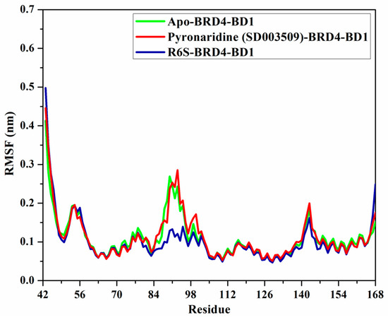 The RMSF of the Cα atoms was studied to investigate the backbone conformational variation and stability of the apo-, pyronaridine-, and R6S-BRD4-BD1 complexes (Figure 10). As shown in Figure 10, the average RMSF values were 0.11, 0.11, and 0.10 nm for the apo-, pyronaridine-, and R6S-BRD4-BD1 complexes, respectively. In addition, the RMSF values of residues 84 to 100 in the R6S-BRD4-BD1 complex were lower than those of apo- and pyronaridine-BRD4-BD1, demonstrating that R6S tends to reduce this region’s flexibility. The larger size of the R6S inhibitor may be the reason for this rigidity. Overall, the RMSF results revealed that the amino acid residues were stationary during the 200 ns MD simulations in the identified compound complex, which is in line with the RMSD data.