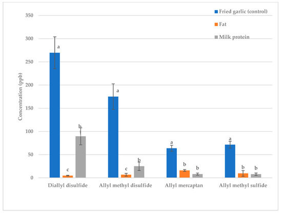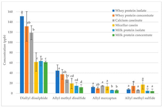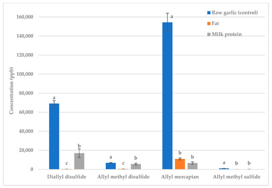 | Volatiles | Raw Garlic (Control) | Whey Protein Isolate | Whey Protein Concentrate | Calcium Caseinate | Micellar Casein | Milk Protein Isolate | Milk Protein Concentrate |