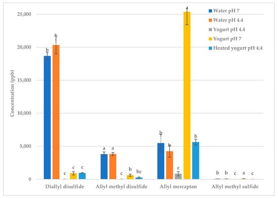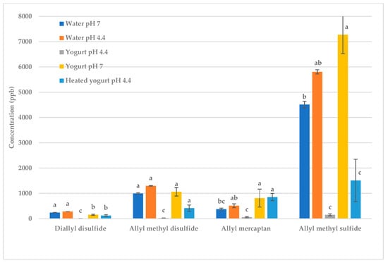 | Volatiles | Garlic (Control) | Yogurt pH 4.4 | Yogurt pH 7 | Water pH 4.4 | Water pH 7 | Heated Yogurt pH 4.4 |