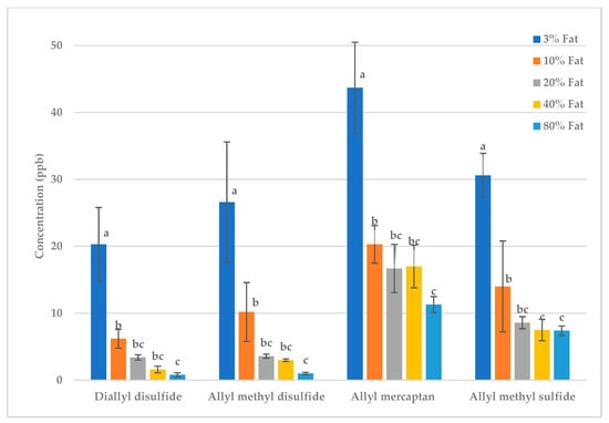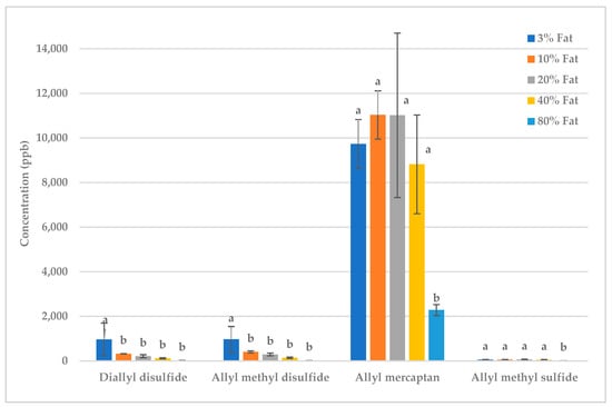 | Allyl methyl sulfide | 383 ± 60 | 103 ± 60 | 4950 ± 1120 | 3950 ± 663 | 3070 ± 197 | 1990 ± 838 |