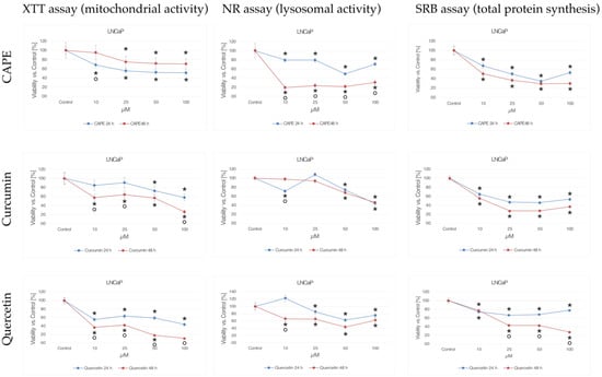 Cytotoxic effects of CAPE, curcumin, and quercetin at concentrations from 10 to 100 μM at 24 h and 48 h incubation time against the LNCaP prostate cancer cells using the XTT-NR-SRB assay. * statistically significant decrease in viability relative to control (p < 0.05); ° statistically significant difference in cell viability after extending tested compounds incubation from 24 to 48 h (p < 0.05).