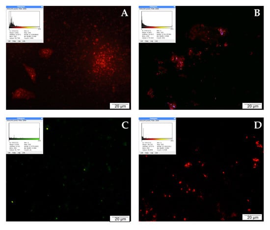 Lysosomal activity demonstrated by LysoTracker Red: (A) cells from the control group, (B) cells treated with CAPE, (C) cells treated with CUR, and (D) cells treated with QUE. Quantitate intensity of wave response (red/green respectively) represented by mean number (p < 0.05). Analyzed by ImageJ software, v. 1.53 m.