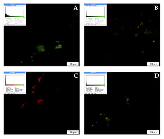 Inner mitochondrial membrane potential (ΔΨm): (A) cells from the control group, (B) cells treated with CAPE, (C) cells treated with CUR, and (D) cells treated with QUE. Quantitate intensity of wave response (red/green, respectively) represented by mean number (p < 0.05). Analyzed using ImageJ software, v. 1.53 m.