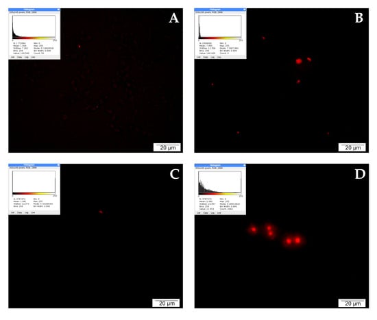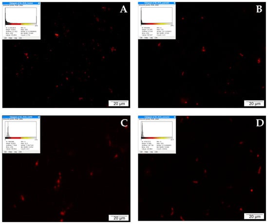 The presence of ROS demonstrated with the participation of dihydroethidium (DHE): (A) cells from the control group, (B) cells treated with quercetin (QUE), (C) cells treated with CAPE, and (D) cells treated with curcumin (CUR). Quantitate intensity of wave response (red/green respectively) represented by mean number (p < 0.05). Analyzed by ImageJ software, v. 1.53 m.